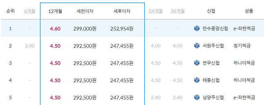 신협에서는 만수중앙신협의 e-파란적금이 가장 높은 금리를 제공합니다. 금리 4.60%로 12개월 동안 매월 100만원씩을 적립했을 때 세후 25만원의 이자를 받을 수 있습니다. 신협은 상호금융기관으로, 보다 지역 밀착형 금융 서비스를 제공하며, e-파란적금은 온라인으로 가입할 수 있어 편리함과 금리 혜택을 모두 누릴 수 있습니다. 금리와 더불어 가입 조건도 까다롭지 않아 많은 이들에게 인기를 끌고 있는 상품입니다.