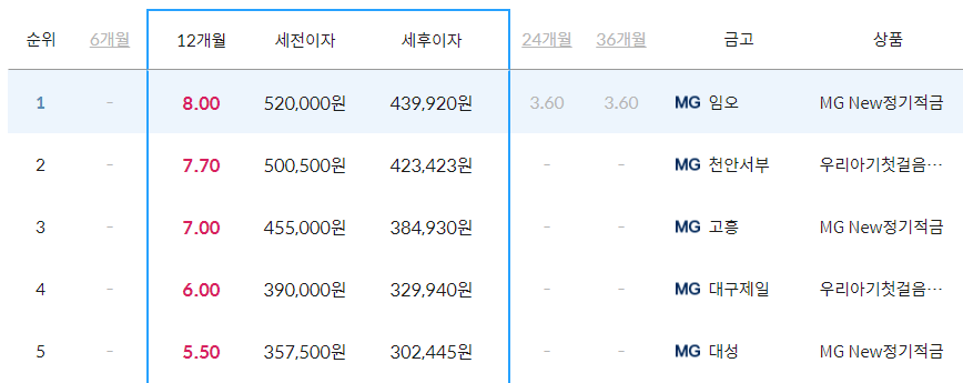 새마을금고에서는 MG임오새마을금고의 MG New정기적금이 8.00%의 금리를 제공하며, 이는 전체 금융기관 중에서도 가장 높은 금리입니다. 월 100만원씩 12개월동안 불입시 12개월 기준 세전 이자는 520,000원, 세후 이자는 439,920원으로 높은 수익을 기대할 수 있습니다. 새마을금고는 지역 밀착형 금융기관으로, 지역사회를 기반으로 한 혜택이 많은 것이 특징입니다.