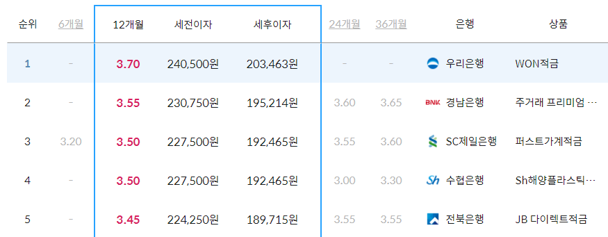 시중은행 중에서 가장 높은 금리를 제공하는 곳은 우리은행의 WON적금으로, 12개월 기준 3.70%의 금리를 제공합니다. 월 100만원씩 12개월동안 불입시 세전 이자는 240,500원, 세후 이자는 203,463원으로 비교적 높은 수익을 기대할 수 있는 상품입니다. 시중은행은 대형 금융기관인 만큼 신뢰도와 안정성이 뛰어나기 때문에 적금 상품을 선택할 때 우선적으로 고려하는 분들에게 추천할 만합니다.