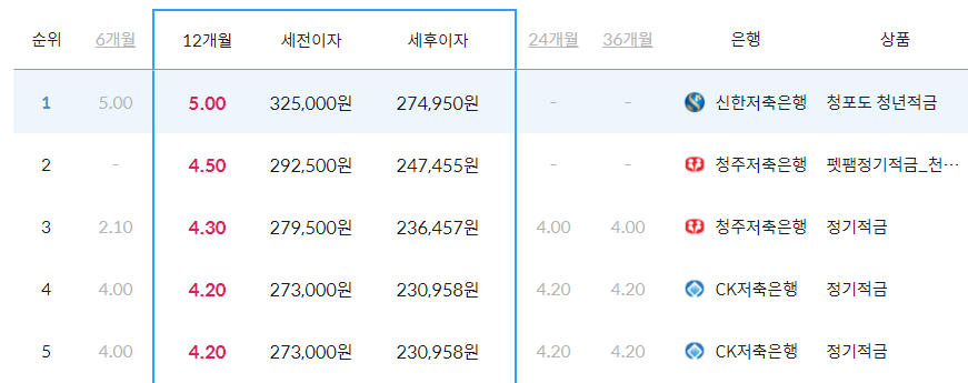저축은행의 경우 신한저축은행의 청포도 청년적금이 가장 높은 금리를 자랑합니다. 12개월 기준 5.00%의 금리를 제공하며, 월 100만원씩 12개월동안 불입시 세전 이자는 325,000원, 세후 이자는 274,950원으로 청년들을 위한 전용 상품입니다. 이 상품은 청년층의 자산 형성을 돕기 위한 목적으로 제공되며, 상대적으로 높은 금리가 강점입니다.
