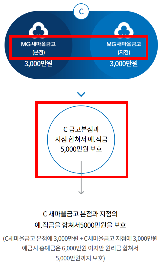 동일한 새마을금고 본점 및 지점의 예금은 합산됩니다. 자세히 예를 들어 설명해보겠습니다. 새마을금고는 각각 독립적인 사업체로 운영되며, 많게는 2 ~ 3개의 지점을 보유하고 있습니다.