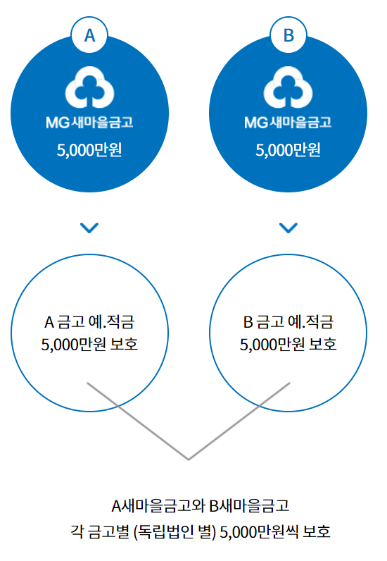 단, A 새마을금고에 5천만원을 예금하고 건너 마을 B 새마을금고에 5천만원을 예금한다면 A 새마을금고와 B 새마을금고는 서로 다른 법인이므로 각각 5천만원, 총 1억원을 보상받을 수 있습니다. 이 점을 잘 기억해두시고 거액의 예금을 새마을금고에 맡기신다면 분산하여 예금자보호를 받으시길 바랍니다.