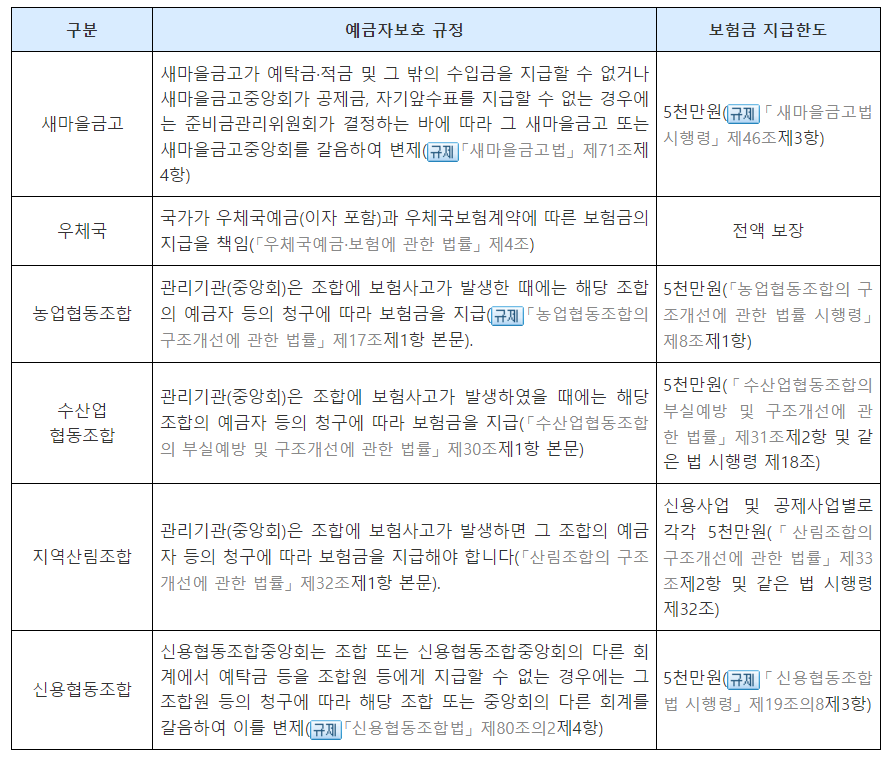 이 예금자보호제도는 새마을금고법으로 명문화되어 있으며, 이미 1983년에 제정된 새마을금고법 제71조에 의해 새마을금고중앙회에 예금자보호준비금이 설치되어 운영되고 있습니다. 이를 통해 새마을금고 예금자의 예금 및 적금 환급이 안정적으로 보장됩니다. 예금자보호준비금은 동법 제72조에 따라 조성되었으며, 새마을금고의 고객들에게 안정성과 신뢰를 제공하는 역할을 수행합니다. 이를 통해 고객들은 새마을금고부도의 위험에도 예금을 안전하게 보호 받을 수 있습니다.