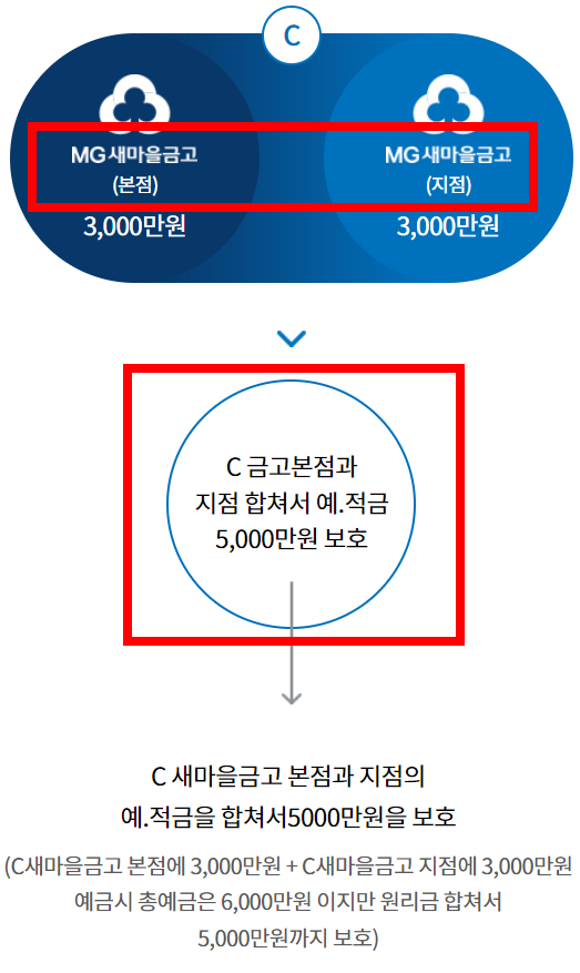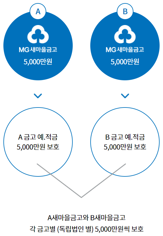 그러나 다른 새마을금고인 B 새마을금고에 5천만원을 예금하면 A 새마을금고와 B 새마을금고는 서로 다른 법인이므로 각각 5천만원씩 총 1억원까지 보상을 받을 수 있습니다. 예금액이 큰 경우라면, 새마을금고부도위험을 고려하여 예금자보호가 가능하도록 분산하여 예금하시는 지혜가 반드시 필요합니다.
