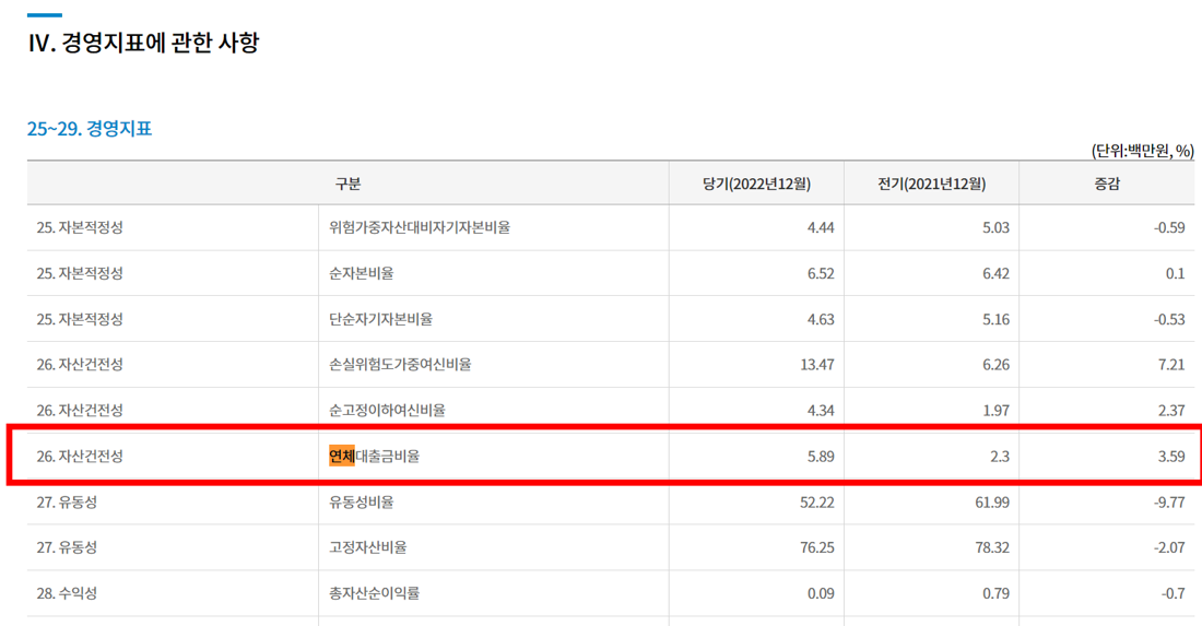 해당 경영지표를 확인해보실 때 2021년 12월 대비 2022년 12월 증감 상황도 함께 보시면 이용중인 새마을금고의 경영이 악화되고 있는지, 개선되고 있는지도 판단하실 수 있습니다.